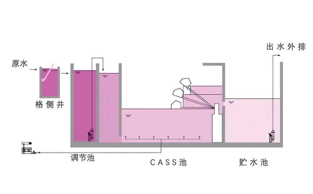 CASS(Cyclic-Activated-Sludge-System)工艺是近年来国际公认的处理屠宰污水,生活污水及工业废水的先进工艺。其基本结构是:在序批式活性污泥法(SBR)的基础上,反应池沿池长方向设计为两部分,前部为生物选择区也称预反应区,后部为主反应区其主反应区后部安装了可升降的自动撇水装置。