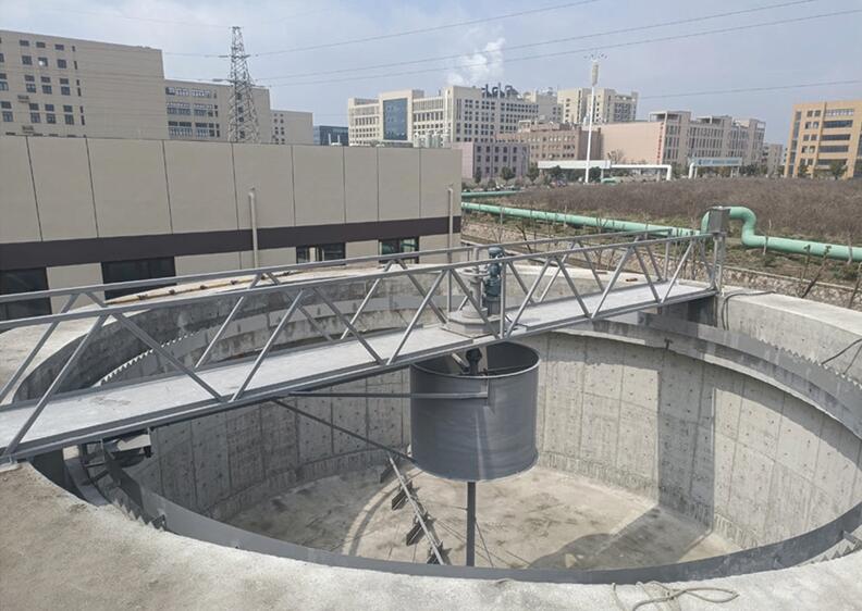 工作桥结构:池径10米以下宜采用型钢梁,大于10米采用桁架梁。一般大于三级摆线减速传动,大扭矩(一般指大于10000N.m)则该用回转支承结构,传动稳定,力矩调整方便安全耙臂角度可设定,以适应不同坡底(例i=1:10);功能可扩展,如可增设力矩控制指示器和自动提耙结构;刮泥板采用橡胶组合结构刮泥效率高;结构简单,安装使用方便。